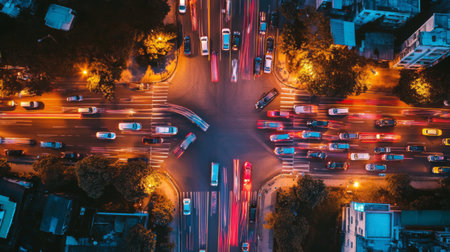 Aerial view of a busy urban intersection at night, showcasing car lights creating dynamic patterns. This vibrant scene captures city life and movement.