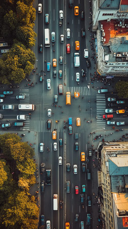 Aerial view of a busy city intersection. Cars, buses, and pedestrians fill the crossroad. Trees line the streets