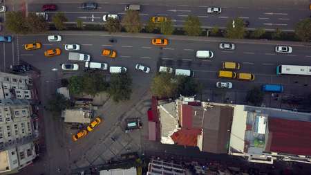 Drones point of view - traffic jam top view, transportation concept, intersection crossroad aerial view from above. Road traffic on crossroad or intersection downtown.