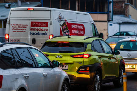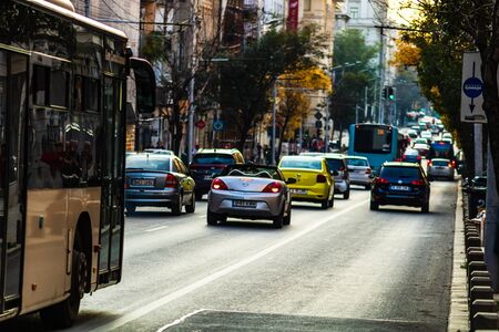 Car traffic in downtown area of Bucharest. Car pollution, traffic jam in the morning and evening in the capital city of Bucharest, Romania, 2020