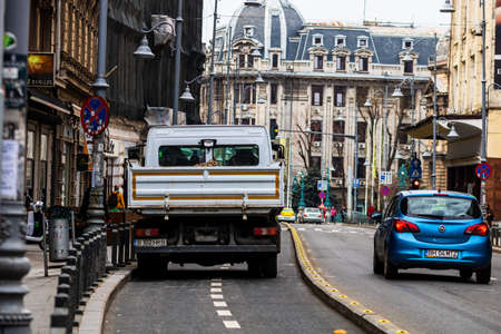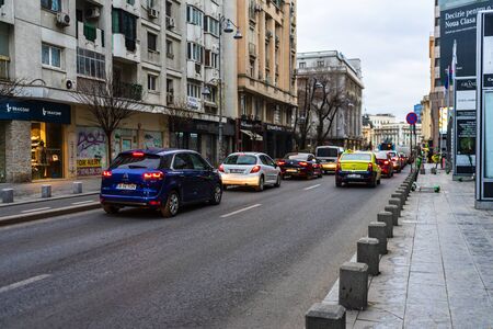 Car traffic at rush hour in downtown area, Victoriei Boulevard (Calea Victoriei) in Bucharest, Romania, 2019