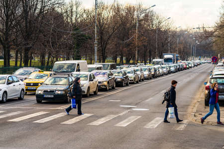 Car traffic at rush hour in downtown area of the city. Car pollution, traffic jam in the morning and evening in the capital city of Bucharest, Romania, 2021