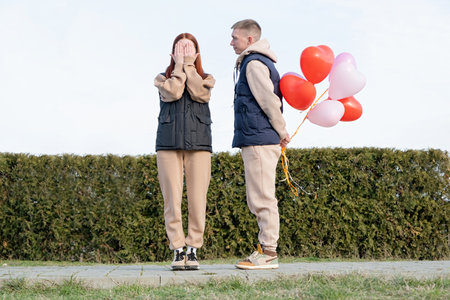 Outdoor photo of happy young woman enjoying date. cheerful romantic couple dating outdoors with balloons, woman closing eyes, man has a present