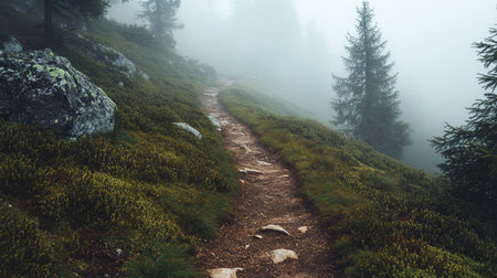 A mountain trail covered in mist, with plenty of space for text in the foggy background