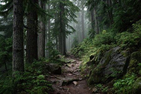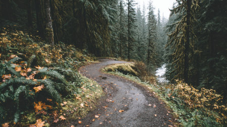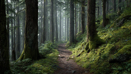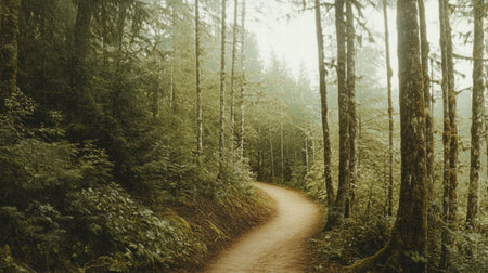 Explore the tranquility of a Pacific Northwest forest trail winding through lush greenery and towering trees on a misty day