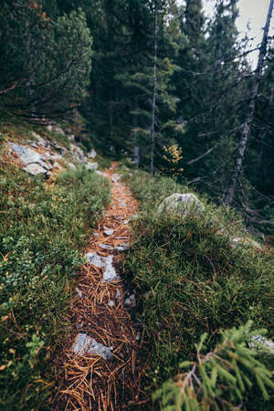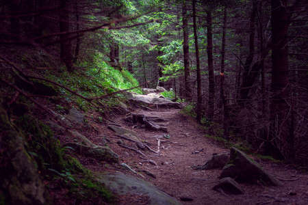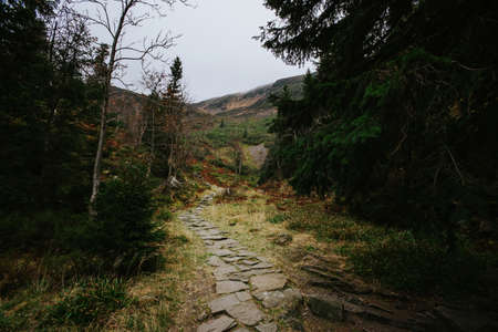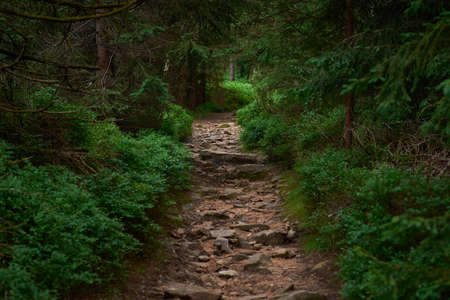 stone road in a coniferous forest in the mountains. Path in deep pine forest. Tatra mountains. Poland. ourney through the Carpathian forests and mountains