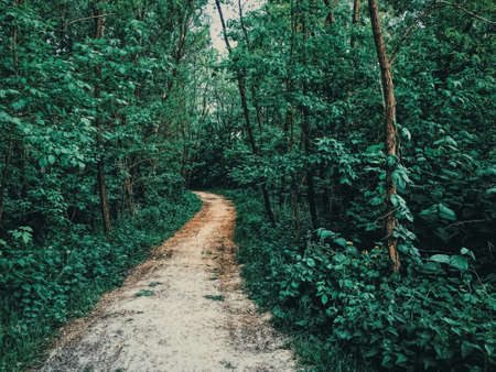 Tourist Hike trail in the Magical Moody Woods on Sunny Summer Day - Concept of the Harmony and Travel in the Countryside