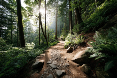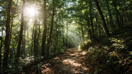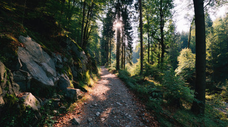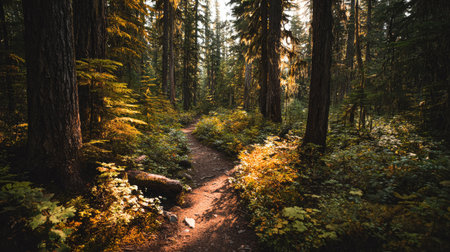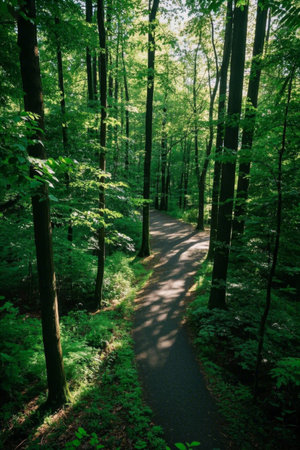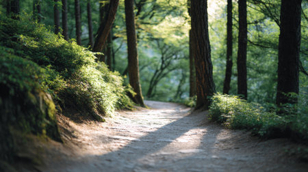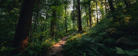 A path winds through a verdant forest, surrounded by tall trees and vibrant foliage. Sunlight filters through the canopy, creating a play of light and shadow. The composition focuses on the natural environment, likely suitable for illustrating themes of nature, travel, or environmental conservation, and various commercial purposes.
