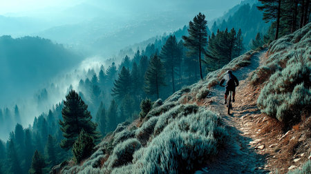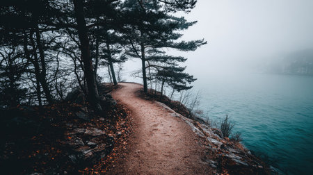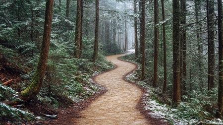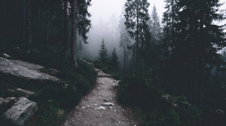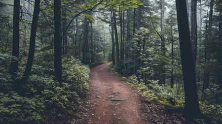 Winding path meanders dense fog laden forest where tall trees and lush greenery create tranquil mysterious ambiance. Nature invites exploration and contemplation.