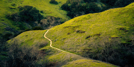Winding dirt hiking trail traversing vibrant green grassy hills with sparse trees, creating a scenic landscape for outdoor activities, journey, and freedom in nature