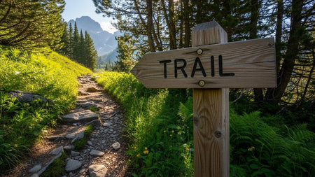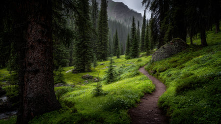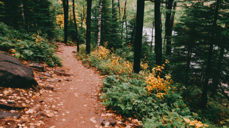 A serene forest trail winds through towering trees, offering a peaceful setting for hikers and nature lovers to explore and enjoy.