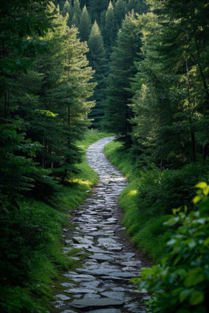 Peaceful forest path through lush green landscape