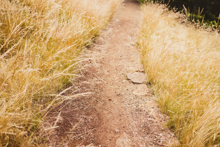 path surrounded by golden wheatgrass plant outdoor in sunny meadow shot at shallow depth of field