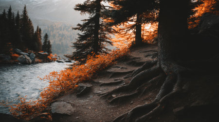 Walking along a scenic trail covered in autumn leaves during sunset in a peaceful forest setting. Generative AI