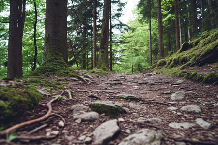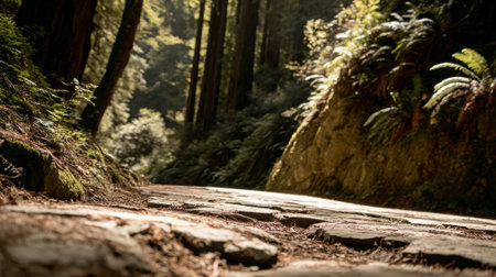 A tranquil forest path winds through lush greenery. Moss covers the rocks and tree roots. A serene escape into nature.
