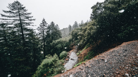 Scenic high angle view of a remote path winding through a lush, green mountain forest during a rain shower, surrounded by tall evergreen trees and a rocky hillside.