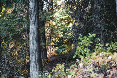 Hiking trail in the evergreen forest in California, USA.