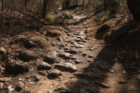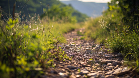 close-up of hiking trail, with individual footsteps visible in the path, created with generative ai