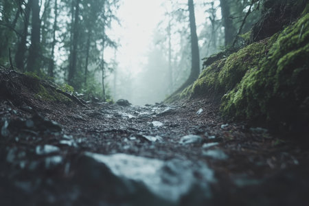 Misty Forest Pathway with Moss Covered Rocks and Towering Trees in Foggy Atmosphere.