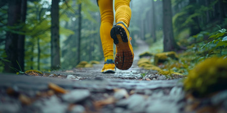 Feet of a runner running on a forest trail