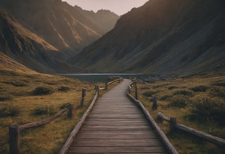 road from planks mountain landscape, realistic illustration