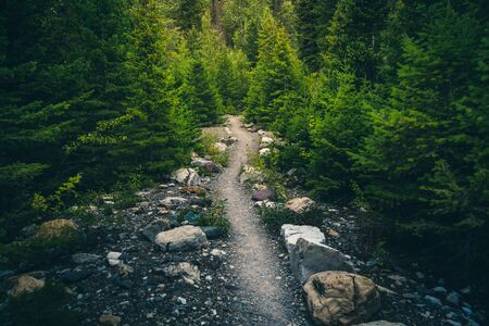 Tourist route. A bumpy path covered with stones hidden in dense forest