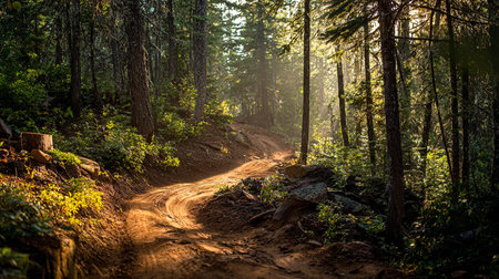 Winding dirt trail through lush forest at sunset, bathed in warm light and long shadows
