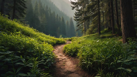 Misty forest path through lush green landscape
