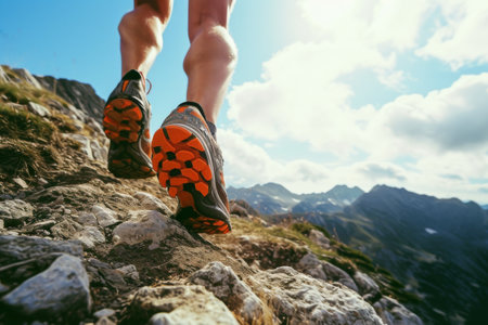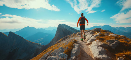 A determined man races up a rugged mountain trail, surrounded by breathtaking natural scenery, A dedicated runner sprinting on a mountain trail, AI Generated