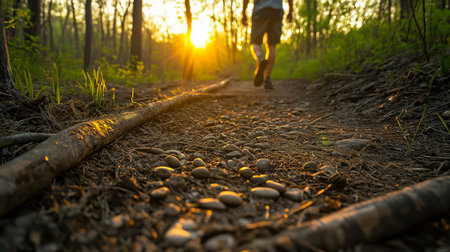 A lone runner strides along a rugged trail at sunset, surrounded by majestic mountains and dust swirling in the warm air, capturing the spirit of adventure.
