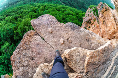 Man hiker steps on the edge of mountain rock above precipice with green forest trees underneath. Caucasus mountain summer scenery. Eagles Rock Shelf on Lenina Mount. Fisheye view