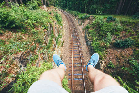Man sitting above railroad track in the middle of the deep forest. Ore Mountains, Czech Republic