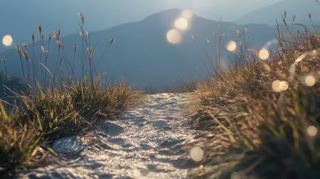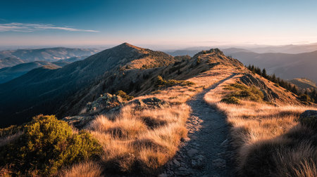 Serene Mountain Trail at Sunset, Majestic Landscape in the Distance