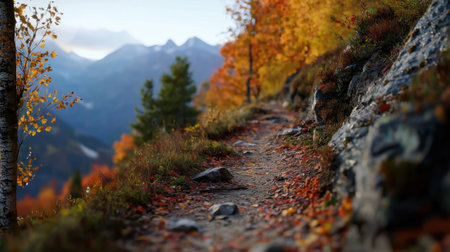 A mountain range with a trail of autumn leaves. The trail is rocky and the leaves are scattered all over the ground. Scene is peaceful and serene, as the natural beauty of the mountains