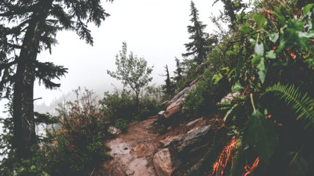 Serene dirt path meanders through foggy woodland with evergreen trees, dense ferns, mossy rocks, and soft mist creating peaceful hiking atmosphere