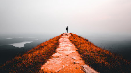 A lone figure stands at the summit of an orange-colored hill, following a stone path. The background is a vast, misty landscape with a distant river, creating a moody and atmospheric scene.