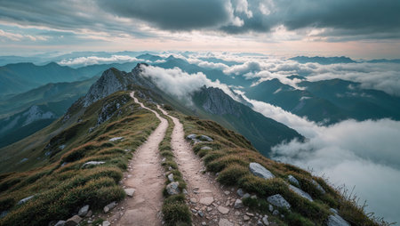 Scenic landscape showcasing a winding mountain path amidst a breathtaking cloudscape, illuminated by the warm glow of the setting sun. Ai generated image