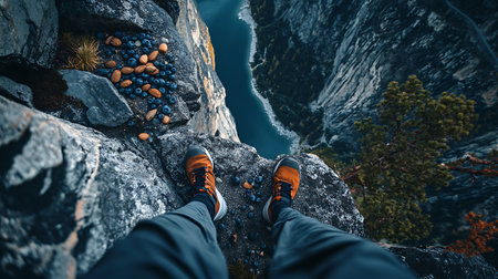 Legs in hiking shoes stand on a cliff edge with nuts and blueberries and a scenic view of mountains, lakes, and green trees.