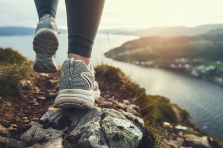 Close up a person's feet walking on rocks , Walking on a trail in the woods , Travel Concept , Generative Ai Technology