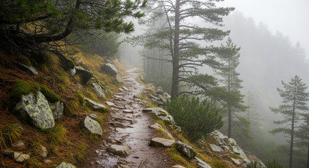 A rugged mountain ridge dominates the scene, its green slopes partially obscured by thick mist and clouds. The natural trail guides the eye across the frame. The image features a cool color palette with soft lighting. Suitable for travel articles, environmental campaigns, or artistic projects.
