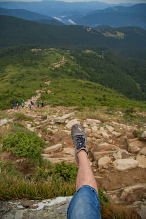Hiker man sitting on edge of cliff in the mountains, view of legs, pov image.