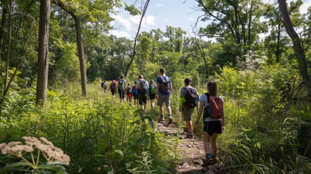 A group of people with backpacks walking down a trail, AI