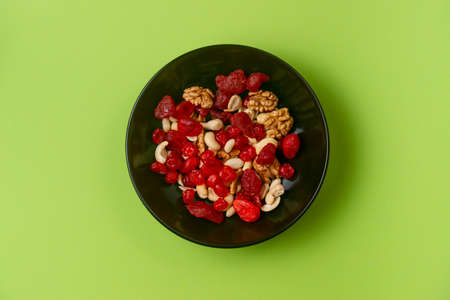 A fresh dried and candied fruits and nuts in black bowl on green bakground. Concept of nutrient and healty breakfast or meal and vegan or vegetarian food.