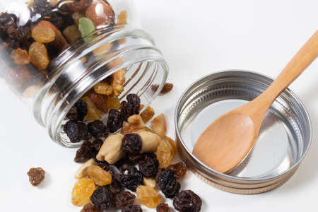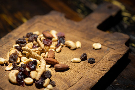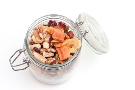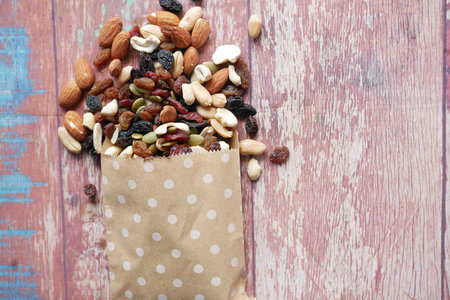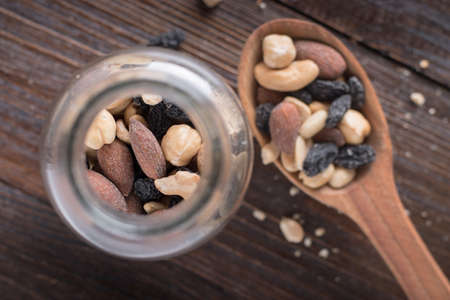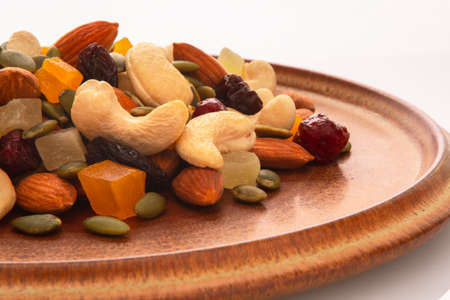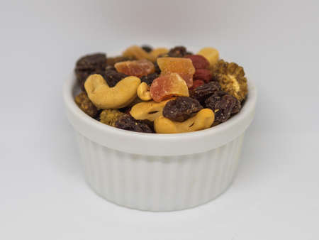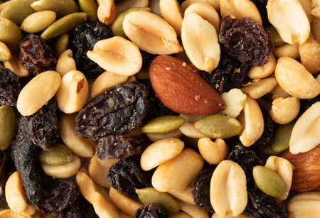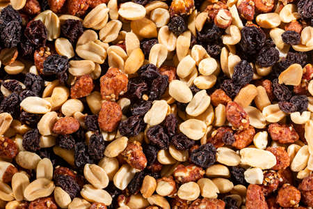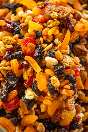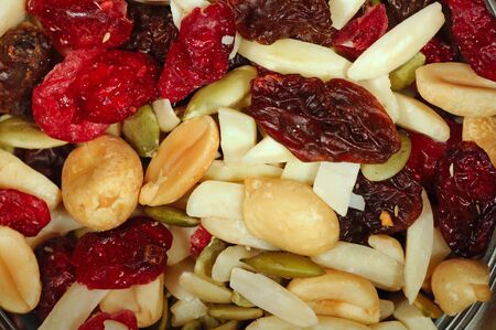 Healthy snack food trail mix of mixed nuts and dried fruits