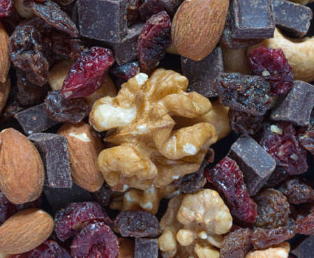 Dried fruits with nuts. Cashew, hazelnuts, peanuts, dried apricots, viburnum, raisins.