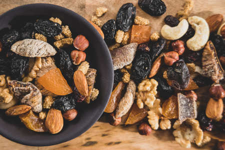 Assorted nuts and candied fruits on a wooden background. Healthy food. Vegan.