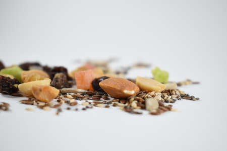 Mix of Healthy Snack of nuts and Other Dried fruits mix on white background. Organic and healthy breakfast. Copy space, Selective focus.
