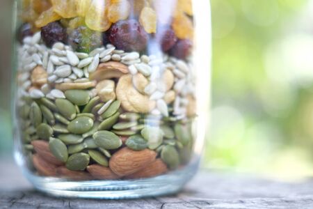 The mixed nuts in clear glass container is on the table with green background. Healthy food are contain in clear glass bottle