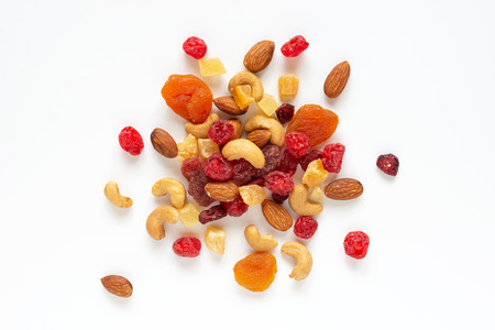 healthy snack: mixed nuts and dried fruits on white background, almond, pineapple, cranberry, papaya, apple, strawberry, cherry, apricot, casshew.