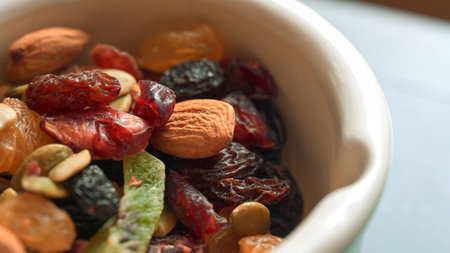 Healthy Dried Fruit and Nut Mix in a Bowl, side view.